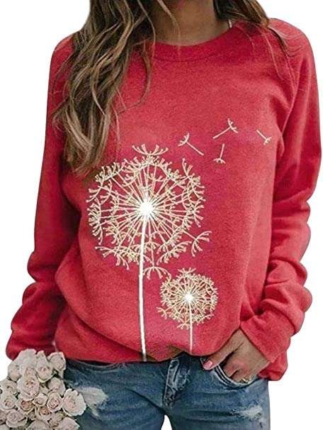 Dresswel Women Dandelion Print Sweatshirt Crew Neck Long Sleeve Tops Basic Jumper Tunic Blouse Shirts
