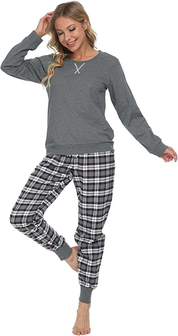 【Design for Feeling】Women’s long pajama set, Two-piece includes: Top & Tee, Long sleeves, Round collar, classic grid bottoms and two sides pockets are made for practicality and fashion, and fastening tie can be adjusted the waist to be tighten or loosen according to your own need which provide you comfortable feeling and prevent the workout trousers loosing.